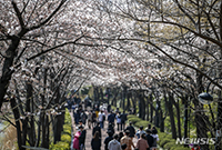 【NEWSIS】5日午前、桜が満開になったソウル・汝矣島の輪中路一帯。ソウルの桜が最も早く開花した昨年と比べ、今年は開花が11日遅かった。