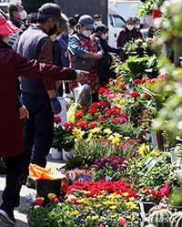 うららかな春の天気となった4日午前、ソウル市中区の花市場で春の花々を買い求める市民の様子。