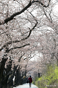 うららかな春の天気となった4日午後、ソウル市松坡区の石村湖水を訪れた市民が、桜並木を歩いて楽しいひとときを過ごしている様子。