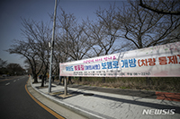 ソウル市永登浦区が3年ぶりに汝矣島の桜並木を開放した29日午後、ソウル市永登浦区の汝矣西路区間に歩道の開放および車両の規制について案内する横断幕が設置された。永登浦区はサクラの開花時期に合わせて4月2..