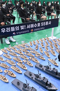 「西海守護の日」まであと二日となった23日午後、京畿道水原市の三一工業高校で開かれた追悼行事で展示された、生徒自身の作った「チャムスリ357号艇」の模型。三一工業高校は、哨戒艦「天安」爆沈事件で戦死し..