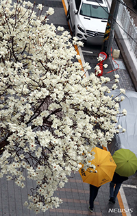 【NEWSIS】春の雨となった13日、釜山市南区にある住宅街では、モクレンの花が満開となり、人々が足を止めていた。