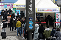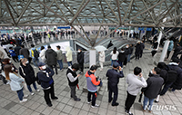 【NEWSIS】新型コロナウイルスの一日新規感染者が35万190人という集計が出た13日、ソウル市中区のソウル駅内に設けられた臨時選別検査所で、検査を受けるために並ぶ人々。