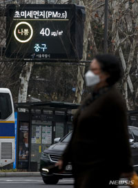 【NEWSIS】PM2.5などの微小粒子状物質の濃度が「不良」となった11日午前、ソウル市中区の世宗大路に設置された電光掲示板には、PM2.5の数値が表示されていた。