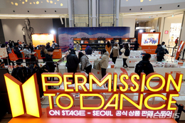 アイドルグループ防弾少年団の「Permission to Dance」コンサート初日となる10日午後、ソウル市松坡区のロッテワールドにオープンした公式商品のポップアップストアで、グッズを見て回る人々の..