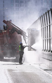 京畿道水原市八達区の東水原高架車道で2日、区庁関係者が清掃車両を用いて防音版など道路施設の清掃を行っているところ。