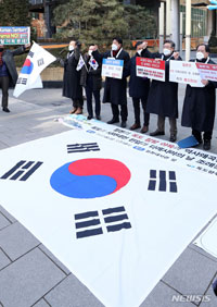 ソウル市鍾路区の少女像付近では22日午前、竹島の日糾弾集会に出席した独島郷友会の会員たちがスローガンを叫んでいた。