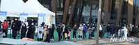 【NEWSIS】18日午前0時時点の新型コロナウイルス新規感染者が10万9831人と発表された。写真は18日朝、ソウル市松坡区の選別診療所で、検査を受けるために並ぶ人々。