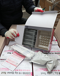 ソウル市教育庁の関係者が18日午後、ソウル市鍾路区のソウル市教育庁主庁舎で自宅診断キットの確認を行っているところ。この自宅診断キットは来週、各教育支援庁を通して幼稚園に配布される。