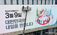 第20代韓国大統領選挙まであと30日となった7日午後、京畿道水原市霊通区の京畿道選挙管理委員会で、関係者が大型の垂れ幕を設置しているところ。