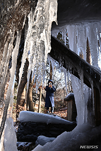 二十四節気の「大寒」に当たる20日午後、京畿道竜仁市の韓国民俗村に設置された水車につららができている様子。