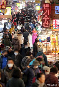 【NEWSIS】旧正月連休(今年は1月31日から2月2日)まであと約2週間となった16日、釜山市釜山鎮区の釜田市場は、祭祀(さいし)用の供え物の材料などを買い求める人々でにぎわっていた。