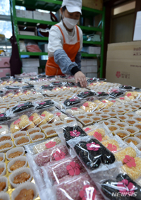 民族の大名節、旧正月(今年は2月1日)を控えた17日、大邱市東区百安洞の「幸せな韓菓」で、殺到する注文をさばくため韓国菓子の包装を行う従業員の様子。