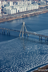 寒波特報が発令された13日午前、ソウル市松坡区のロッテワールドタワー展望台ソウルスカイから眺めた漢江には氷が張っていた。