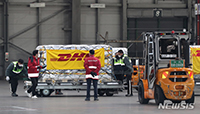仁川国際空港貨物ターミナルで13日午後、関係者らがファイザー社の経口用新型コロナ治療薬「パクスロビド」2万1000人分の荷役作業を行っているところ。