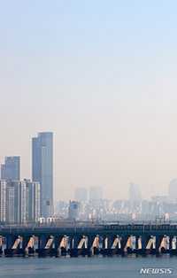 PM2.5の濃度が「悪い」のレベルを示した7日、ソウルの漢江鉄橋の向こう側に見える都心部は白っぽくかすんでいる。