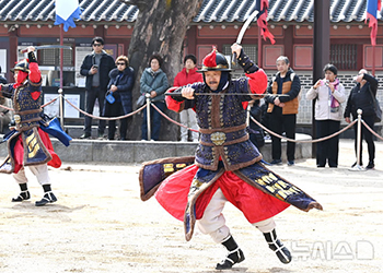 【NEWSIS】二十四節季の一つ「啓蟄」に当たる5日、京畿道水原市八達区の華城行宮では、極寒期定期休演を終えた水原市立公演団のメンバーが「武芸二十四技」の公演を行っていた。