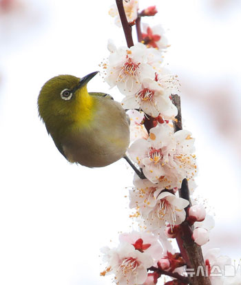 【NEWSIS】晴天になった6日午前、済州市建入洞で、ウメの木に飛んできたメジロが花の蜜を吸っている様子。