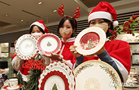 ソウル市東大門区の韓国陶磁器中央店で9日午前、コンパニオンらがさまざまなデザインのクリスマス用ギフトセットをPRした。