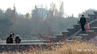 全羅北道全州市のPM2.5濃度が改善せず、「悪い」の水準が続いている7日、徳津公園を散策する市民の背後に広がる全州市中心部は白っぽく染まっていた。