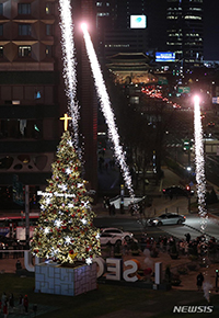 27日夜、ソウル広場に設置されたクリスマスツリーがライトで明るく輝いている様子。