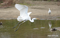 全羅北道全州市の三川川に飛来し、力強く羽ばたいているシラサギの様子。