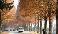 うららかな天気が続いている20日、全羅北道鎮安郡ではメタセコイア並木道が赤く色付き、訪れた市民が秋の趣を感じつつ散策を楽しんでいた。