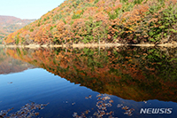 18日午前、慶尚南道南海郡三東面の内山里では、山裾を彩る紅葉の様子が湖水に映り、晩秋の趣を増していた。