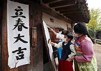 国立民俗博物館(ソウル市鍾路区)の野外展示場「梧村宅」で19日午前、子どもたちが障子貼りの風俗体験をしているところ。