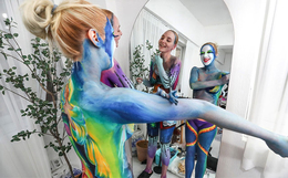 ボディペイント・コンテストを終えたモデルたちが、鏡の前で体に塗っていた絵の具をウエットティッシュで消している。モデルたちは鏡を見ながら「少し前まで美しい芸術作品だったのに、一瞬にして映画『アバター』..