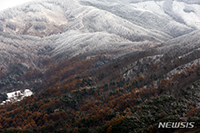 江原道横城郡の青太山をすっかり覆った雪景色と秋の茶色い山が11日、一つの空間で素晴らしいハーモニーをなしていた。