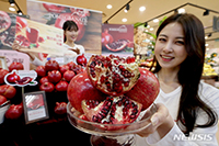 在韓米国大使館農産物貿易事務所(ATO)のアンドリュー・アンダーソン所長とコンパニオンが9日午前、ソウルの大手スーパー「ロッテマート」ソウル駅店で、初冬を代表するフルーツの「米国カリフォルニア産ざくろ..