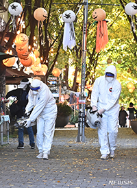 ハロウィンまであと四日と迫った27日午後、京畿道竜仁市宝亭洞のカフェ通りでは、器興区保健所の関係者らが新型コロナ予防のため防疫消毒を行っていた。