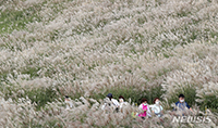 二十四節気の一つで、冷たい露が降り始める時期を意味する「寒露」に当たる8日、済州市涯月邑鳳城里のセビョルオルムを訪れた観光客が、穂を付けたススキの野原の道を歩いて楽しい一時を過ごしている様子。