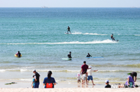昼間の気温が30度を上回るなど真夏の天気となった4日午後、済州市涯月洞の郭支海水浴場では、訪れたレジャー客が水遊びをして楽しい一時を過ごしていた。韓国気象庁によるとこの日、済州市の昼間の最高気温は30..