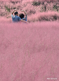 開天節(檀君神話に基づく韓国の建国記念日)の代替公休日に当たる4日、慶尚北道漆谷郡の架山スピア樹木園では、訪れた人々がミューレンベルギアのピンク色の波の中で秋の趣を満喫していた。