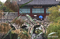 秋雨が降った6日、京畿道水原市八達区の水原華城華虹門にて、傘をさして散策する市民の様子。