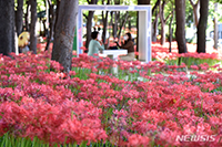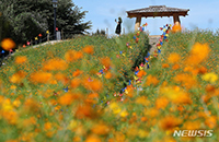 晴天となった16日午前、オリンピック公園(ソウル市松坡区)のトゥルコッマルでは、市民がキバナコスモスの写真を撮っていた。