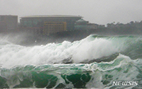 【NEWSIS】台風14号「CHANTHU(チャンスー)」が北上中の16日午前、済州特別自治道西帰浦市近くの海上で、建物の高さと同じくらいの高波が観測された。気象庁によると、台風が通過する間、済州地..