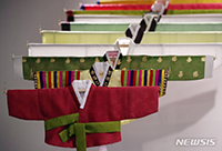 ソウル市江南区の国家無形文化財伝授教育館で16日午後、国家無形文化財「針線匠]」の技能保有者である具恵子(ク・ヘジャ)さんの初の個展「時間の着物を仕立てて共に」を訪れた市民が、さまざまなチョゴリ作品を..