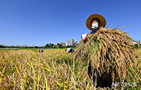 【NEWSIS】秋晴れとなった14日午後、京畿道水原市内の農村振興庁国立食糧科学院作物研究棟で、関係者が黄金色に実ってこうべを垂れた稲を収穫した。
