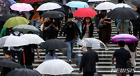 【NEWSIS】朝から雨となった7日午前、ソウル・竜山駅前で傘をさし、足早に横断歩道を渡る人々。