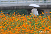 12日午後、ソウル市陽川区の安養川生態公園で咲いているキバナコスモスの様子。
