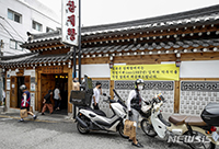 韓国の暦で酷暑の時期とされる三伏の最後に当たる「末伏」を迎えた10日午後、ソウル市鍾路区の参鶏湯店前で、包装済みの参鶏湯をバイクに載せている配達運転手。