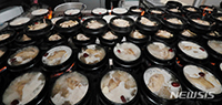 【NEWSIS】本格的な暑さが始まると言われる「初伏」(夏至後の3回目の庚〈かのえ〉の日)を迎えた11日、全羅北道全州市内の参鶏湯(サムゲタン)専門店では、従業員が大量の参鶏湯を作っていた。