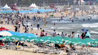 【NEWSIS】釜山地域に三日連続で猛暑注意報が発令された11日、釜山市内の海雲台海水浴場では市民や観光客たちが暑さをしのいでいた。