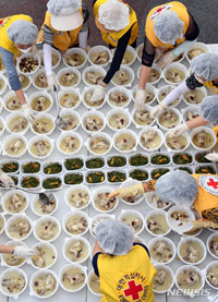 大韓赤十字釜山支社所属のボランティアが14日午前、釜山市江西区のノクサン洞住民センターで、恵まれない階層の人々に届ける参鶏湯300人分を配分した後、包装しているところ。今回の参鶏湯分かち合いのため、地..