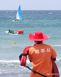 昼間の気温が30度を超えるなど暑い一日となった9日午後、済州市三陽海水浴場を訪れた避暑客が水遊びをして暑さを紛らわせている様子。韓国気象庁はこの日、済州東部・西部・北部地域に猛暑注意報を発令した。