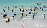 梅雨が小康状態となった10日午後、済州市翰林邑の挟才海水浴場を訪れた避暑客が水遊びを楽しみ、暑さを紛らわせている様子。韓国気象庁によると、済州東部・西部・北部地域では二日間にわたり猛暑注意報の発令が続..