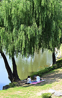 暑い一日となった2日の午後、京畿道水原市八達区の世界文化遺産「華城・訪花随柳亭」を訪れた市民が、木陰で一休みしている様子。
